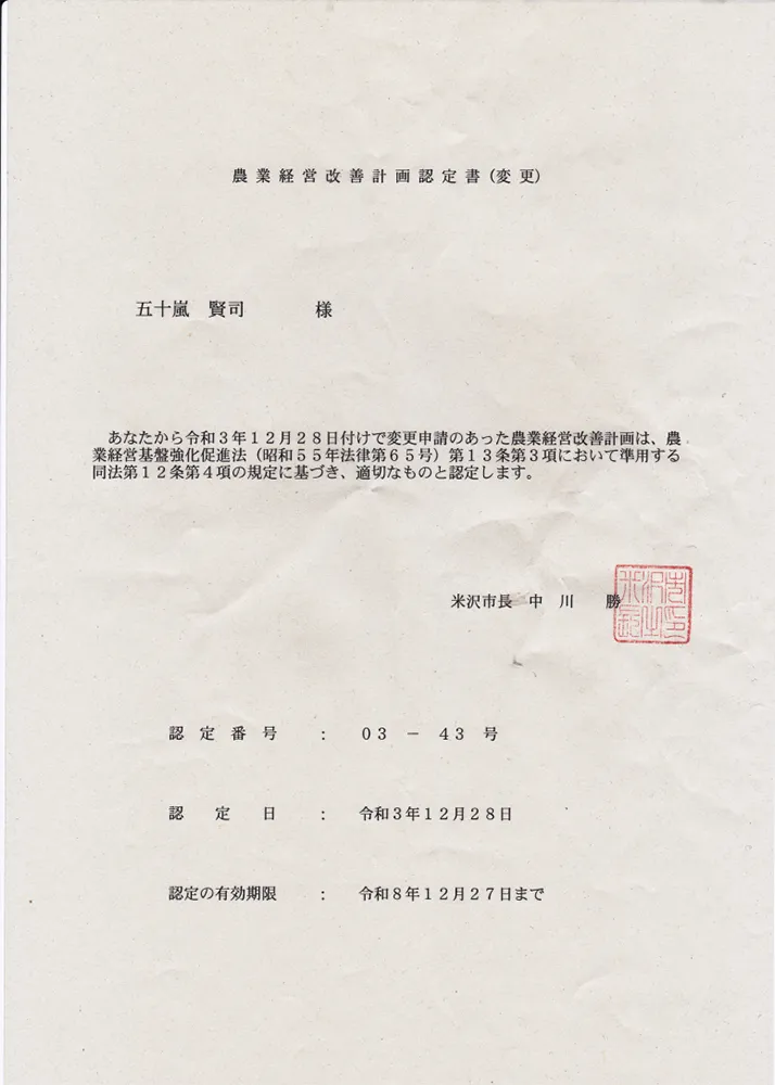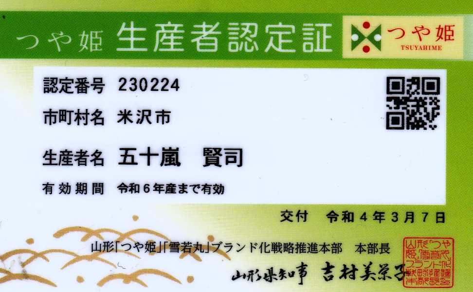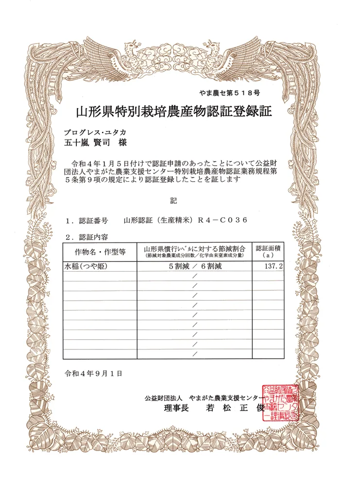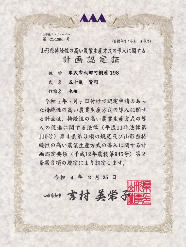私たちは、山形県より「エコファーマー」の認定を受けています。お米は、土の状態によって味が大きく変わるもの。だからこそ、目に見えない「土づくり」を何より大切にしています。
